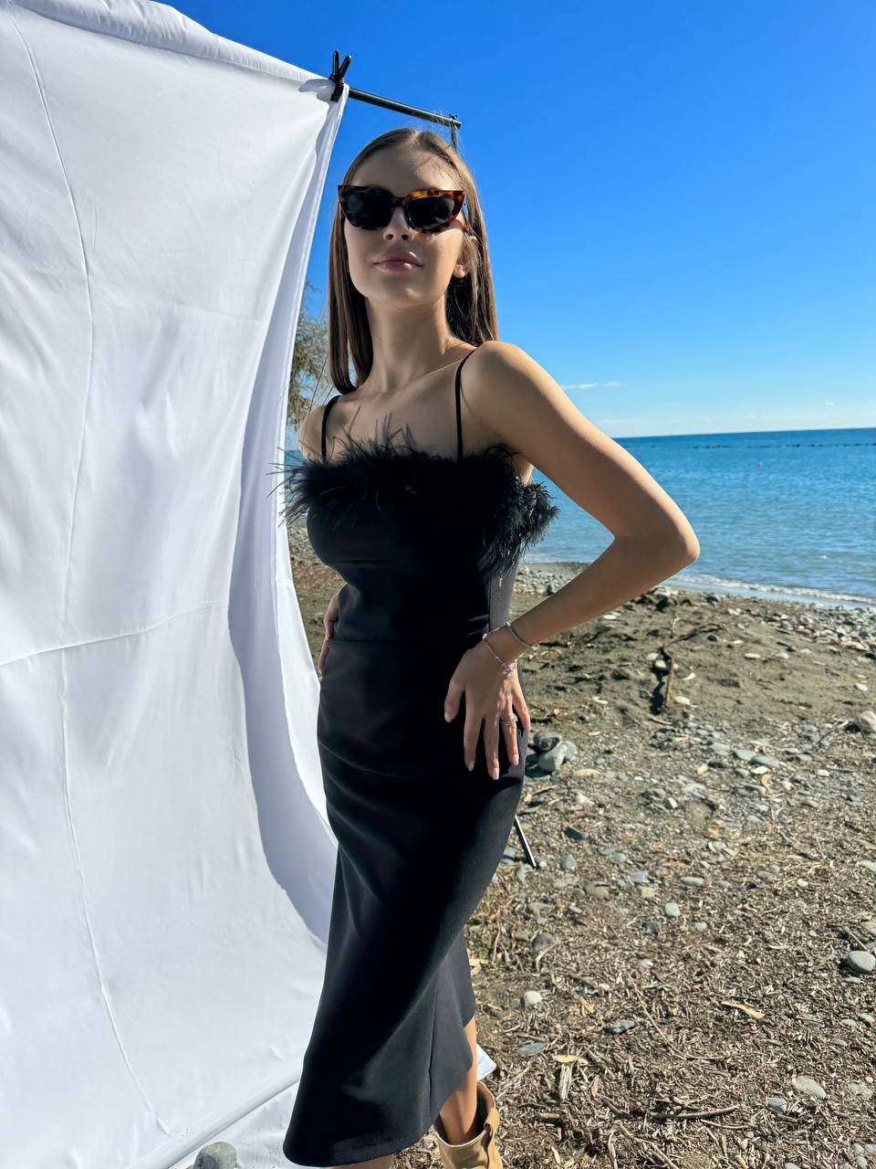 This dress offers a soft feel and a lavish appearance. Midi bodycon dress with black feathers and adjustable spaghetti straps