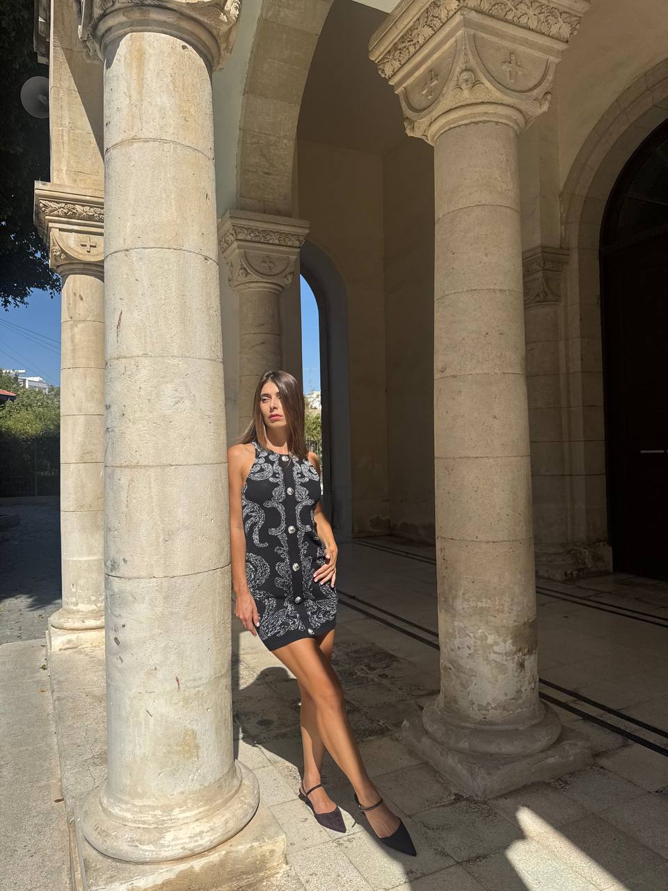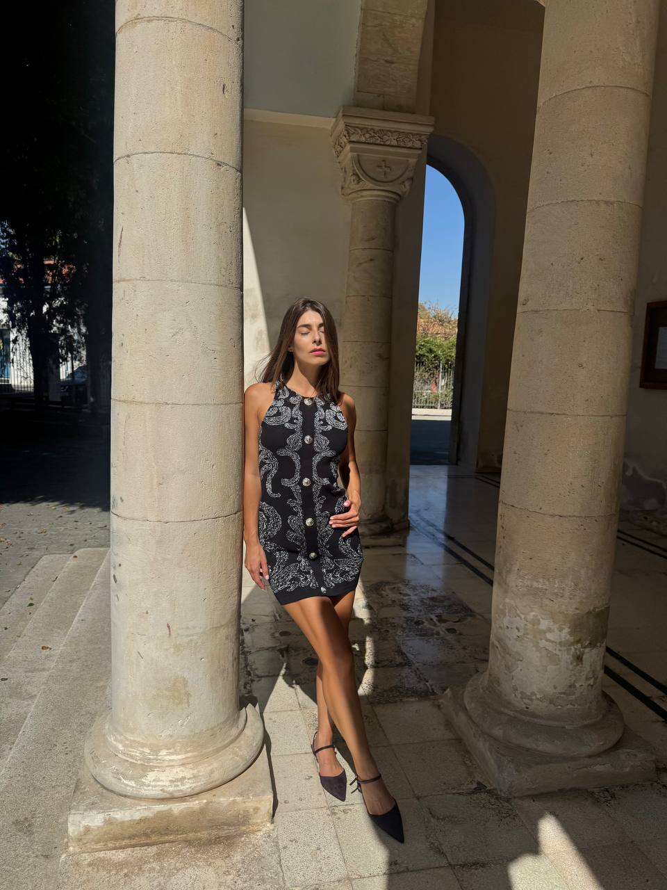 Sleeveless, contrasting lurex paisley pattern,silver metal buttons on the front,short and tight fit.
