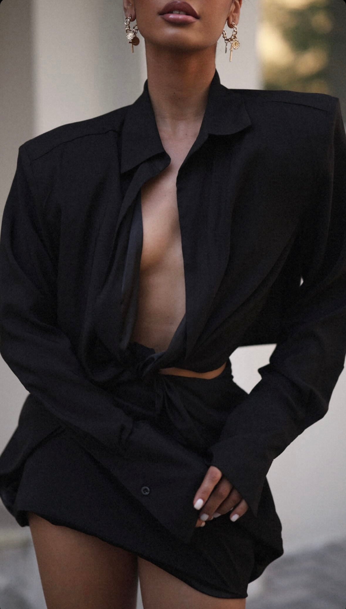 Black long sleeve mini shoulder dress with twisted detail in front