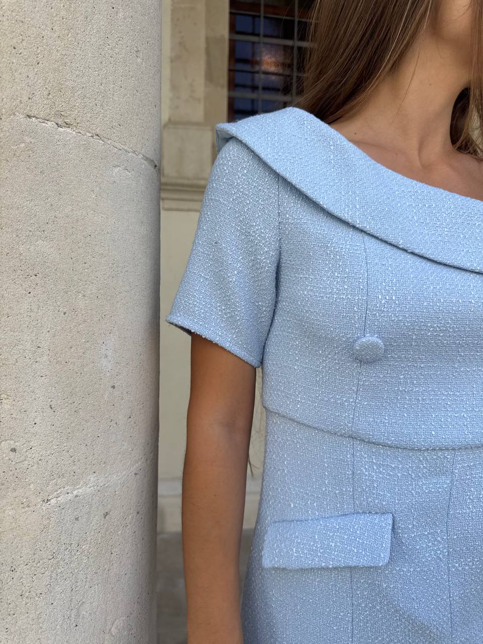The asymmetrical wide neckline ,blue textured dress. The double-breasted bodice with covered buttons, , and midi length hem bring plenty of elegance and subtle femininity.
