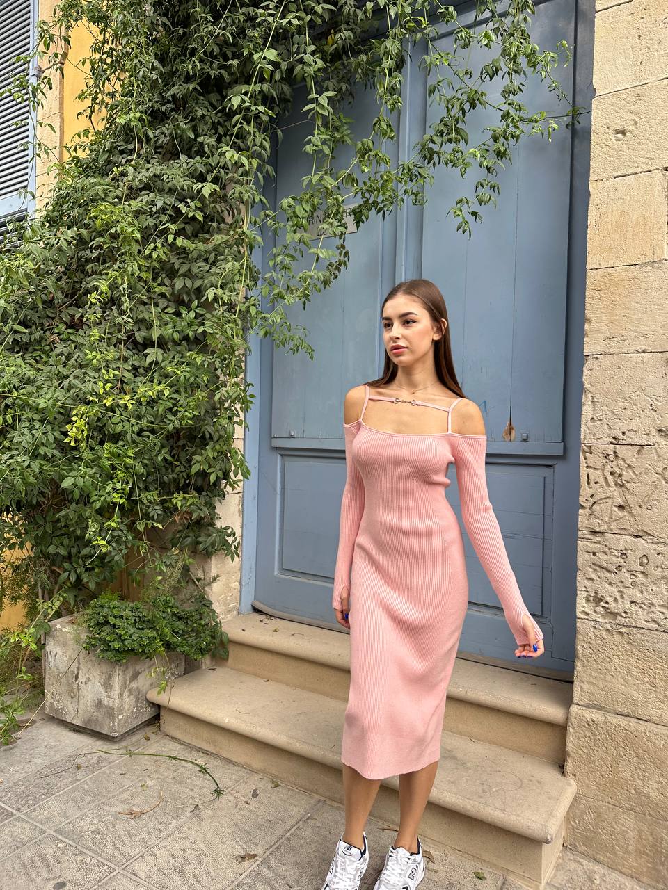 Off-shoulder midi dress featuring rose pink, stretch-design, ribbed knit, detailed chest cuff with thin straps.