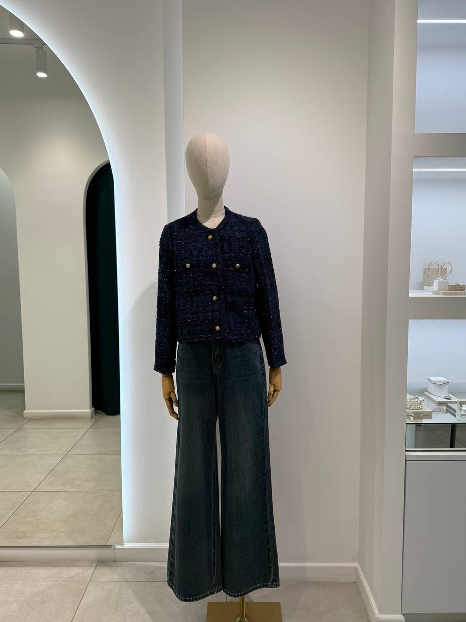 is a timeless and elegant layering piece with a distinctly French chic aesthetic. It features a textured, boucle fabric with subtle interwoven metallic threads, and a clean, collarless round neckline.