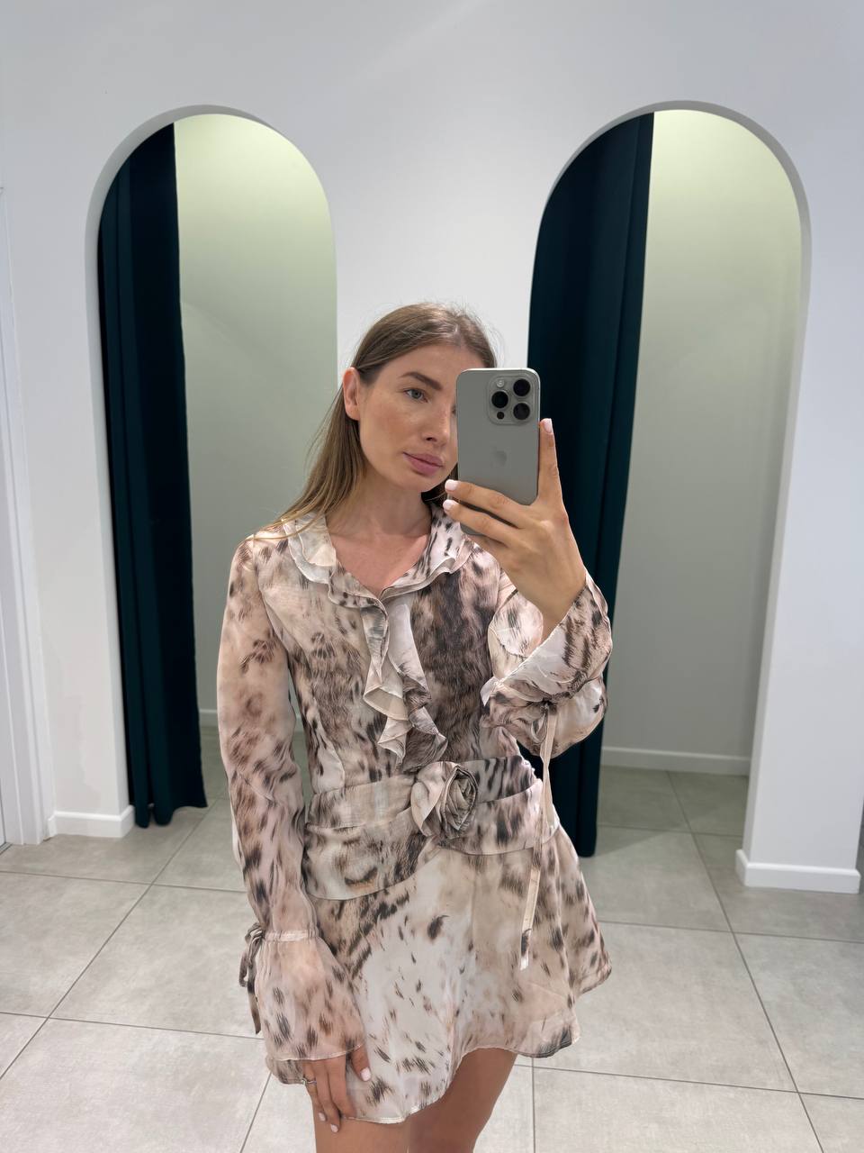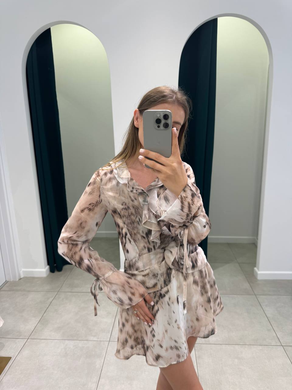 Printed short dress detailed with frilled V-neck, drapery with rose, elasticated bell cuffs and side concealed zip fastening.