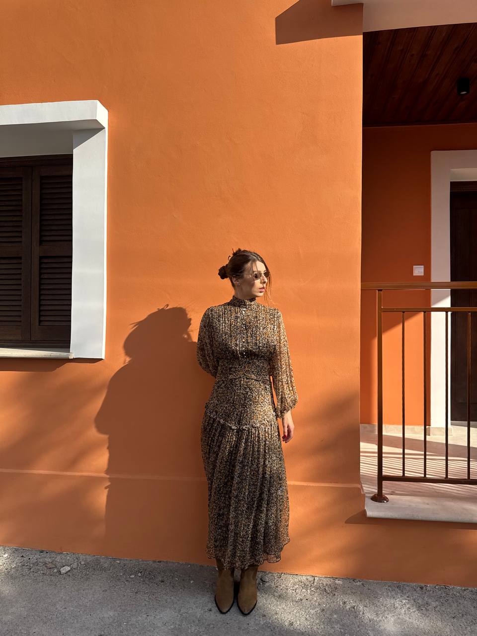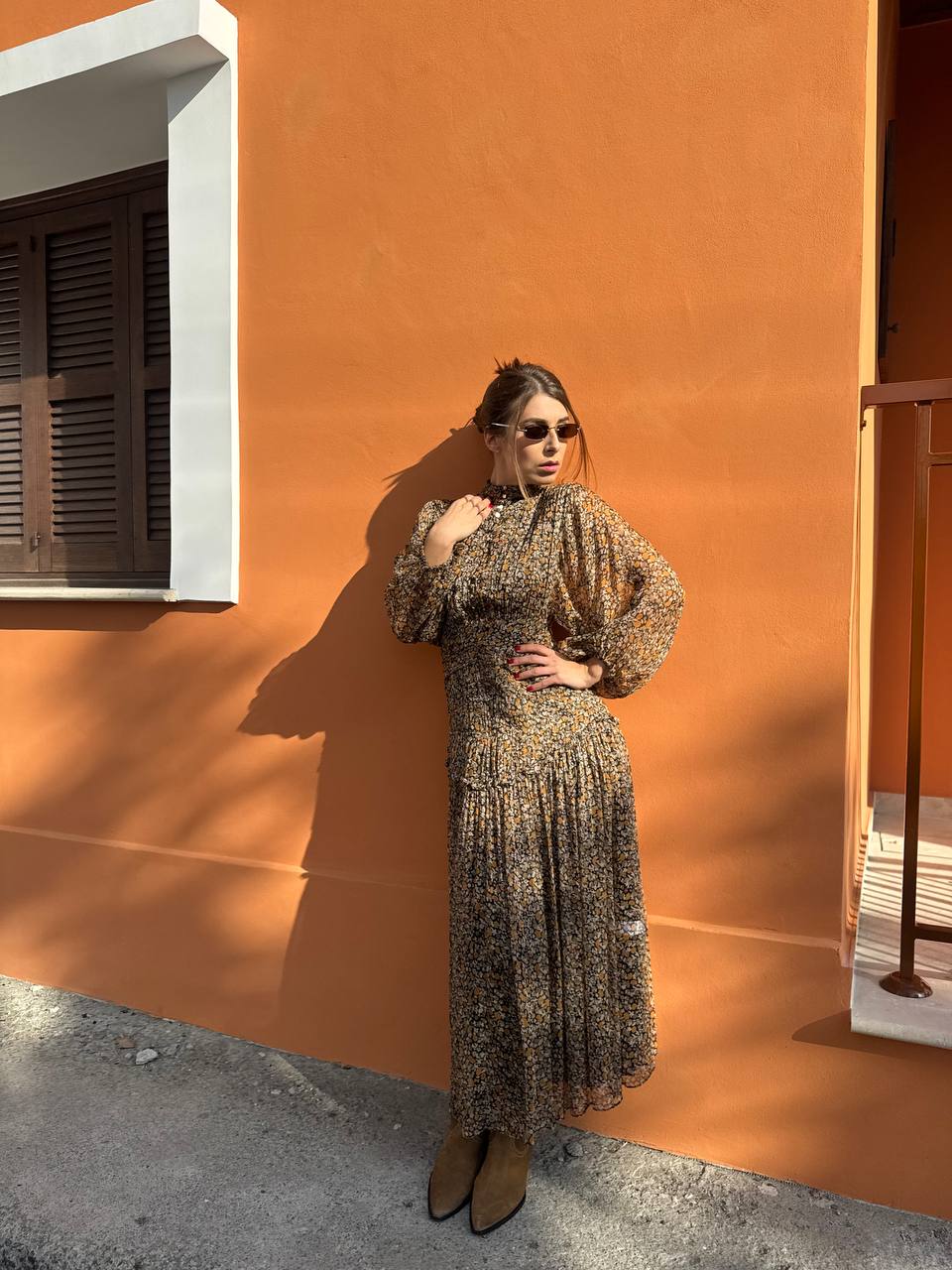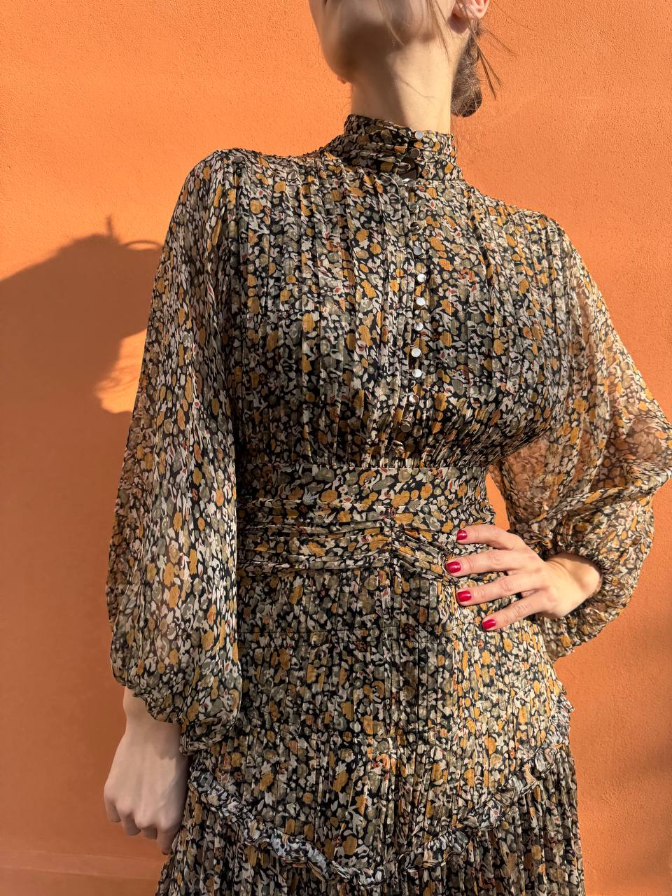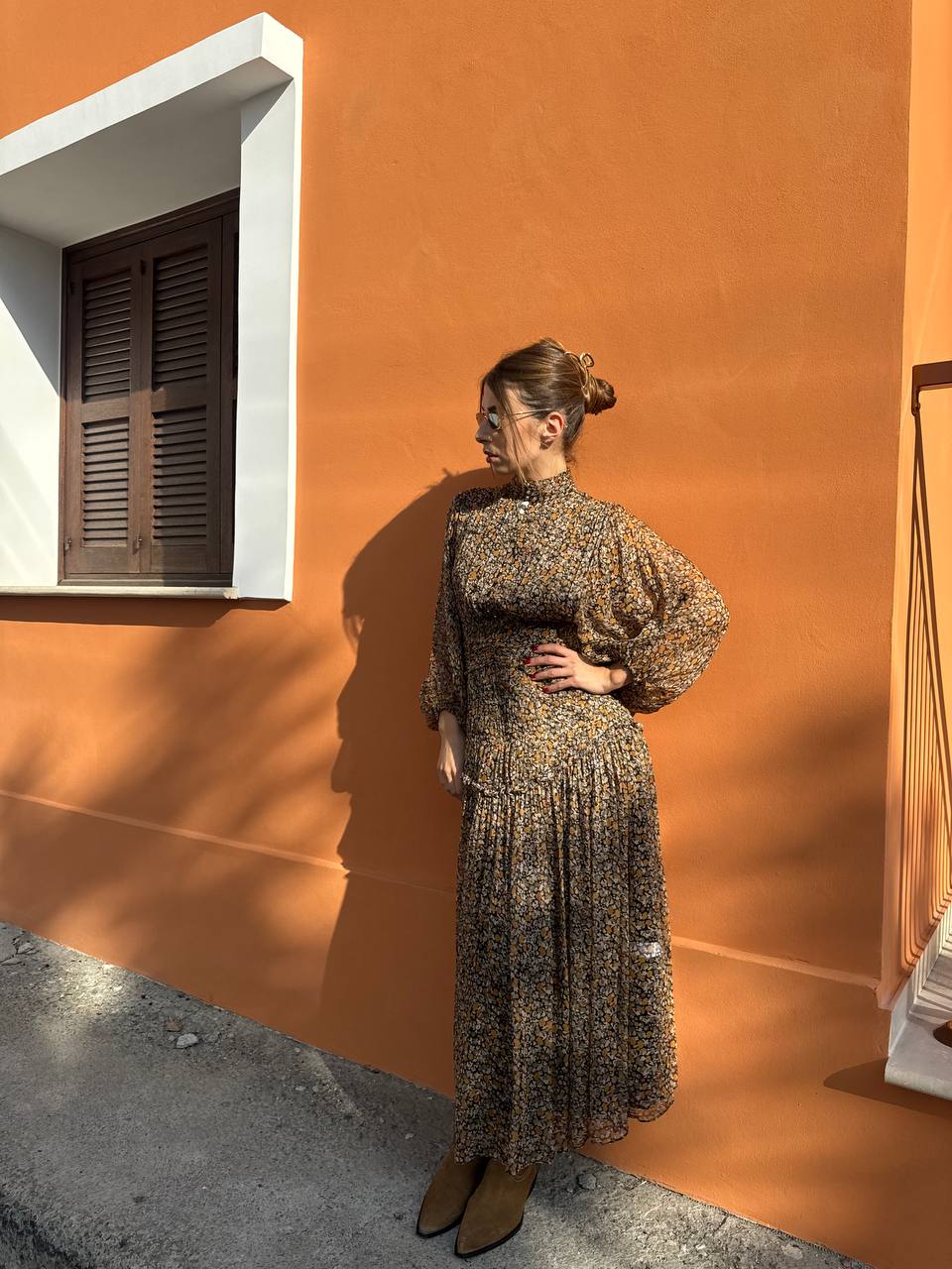 Balloon sleeve ruched midi dress in a light weight semi-sheer viscose.