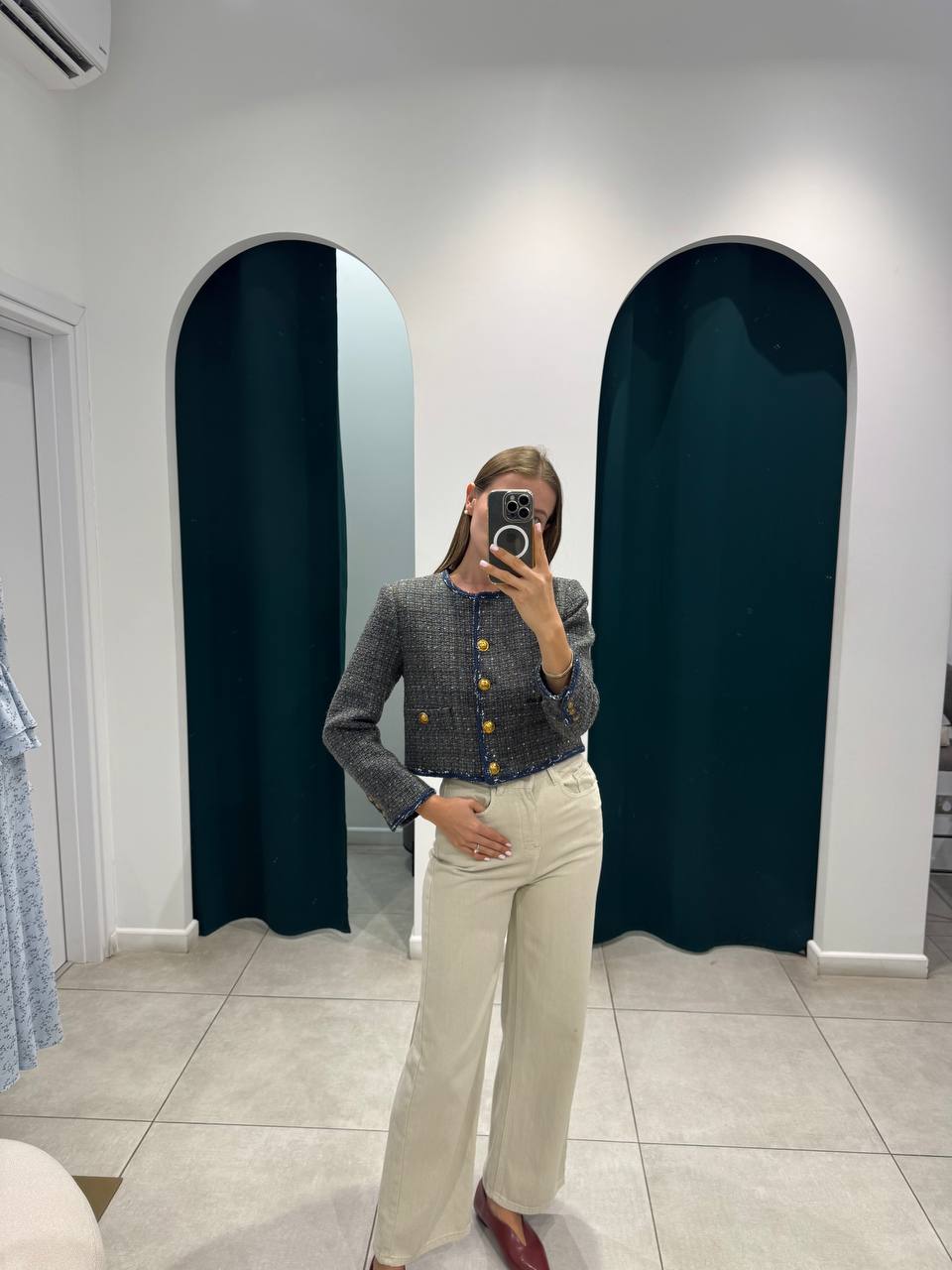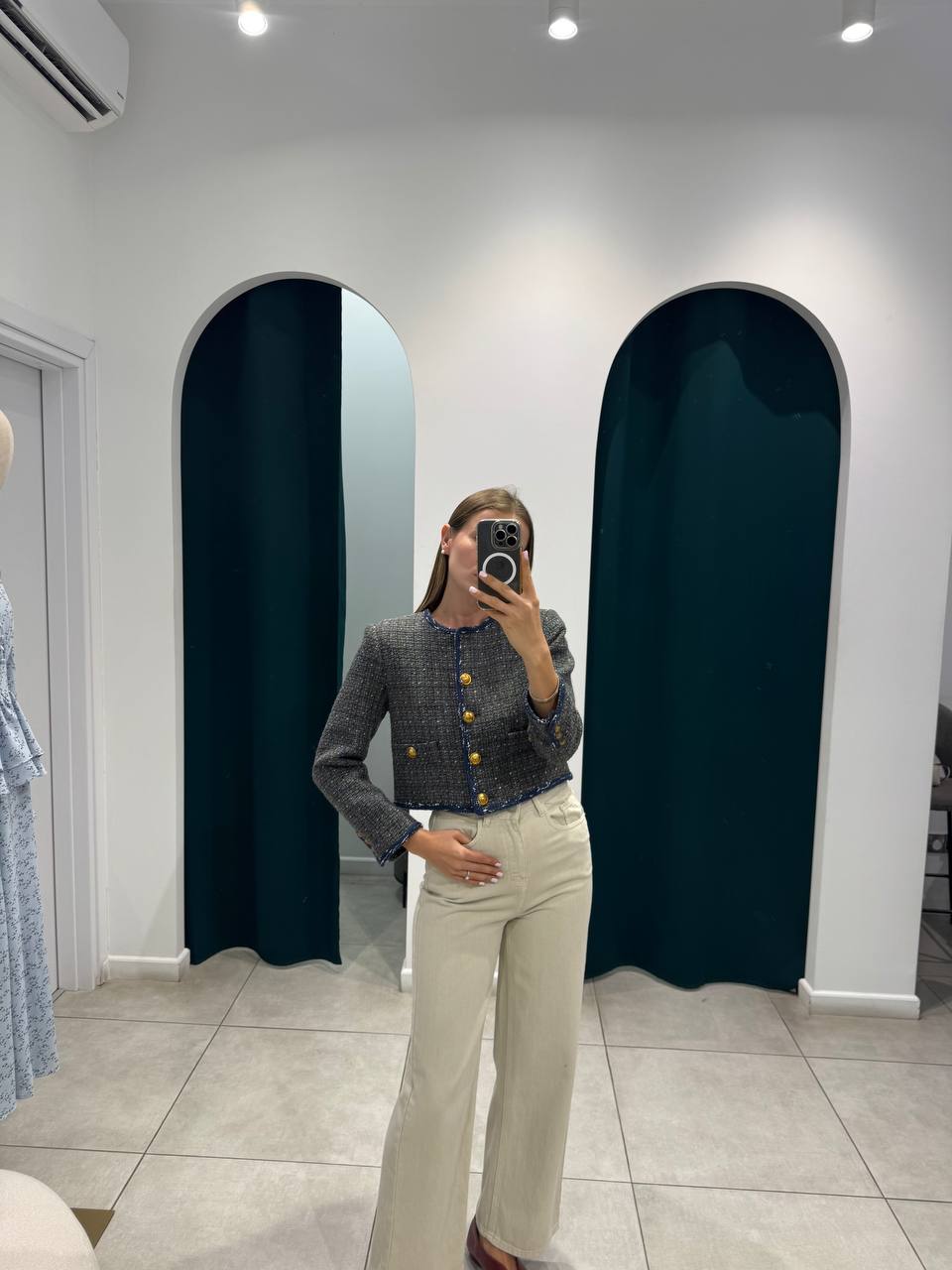 Designed for a tailored, fitted cut, this jacket elevates any outfit with its sophisticated texture and classic details.Detailed colorful trim along the edges, including the round neckline, cuffs, and hem, adds a refined and unique accent.A row of elegant gold-tone buttons down the front adds a touch of luxury and contrast.The cropped silhouette hits at the natural waist, making it a versatile layering piece that pairs beautifully with high-waisted skirts, trousers, or jeans.