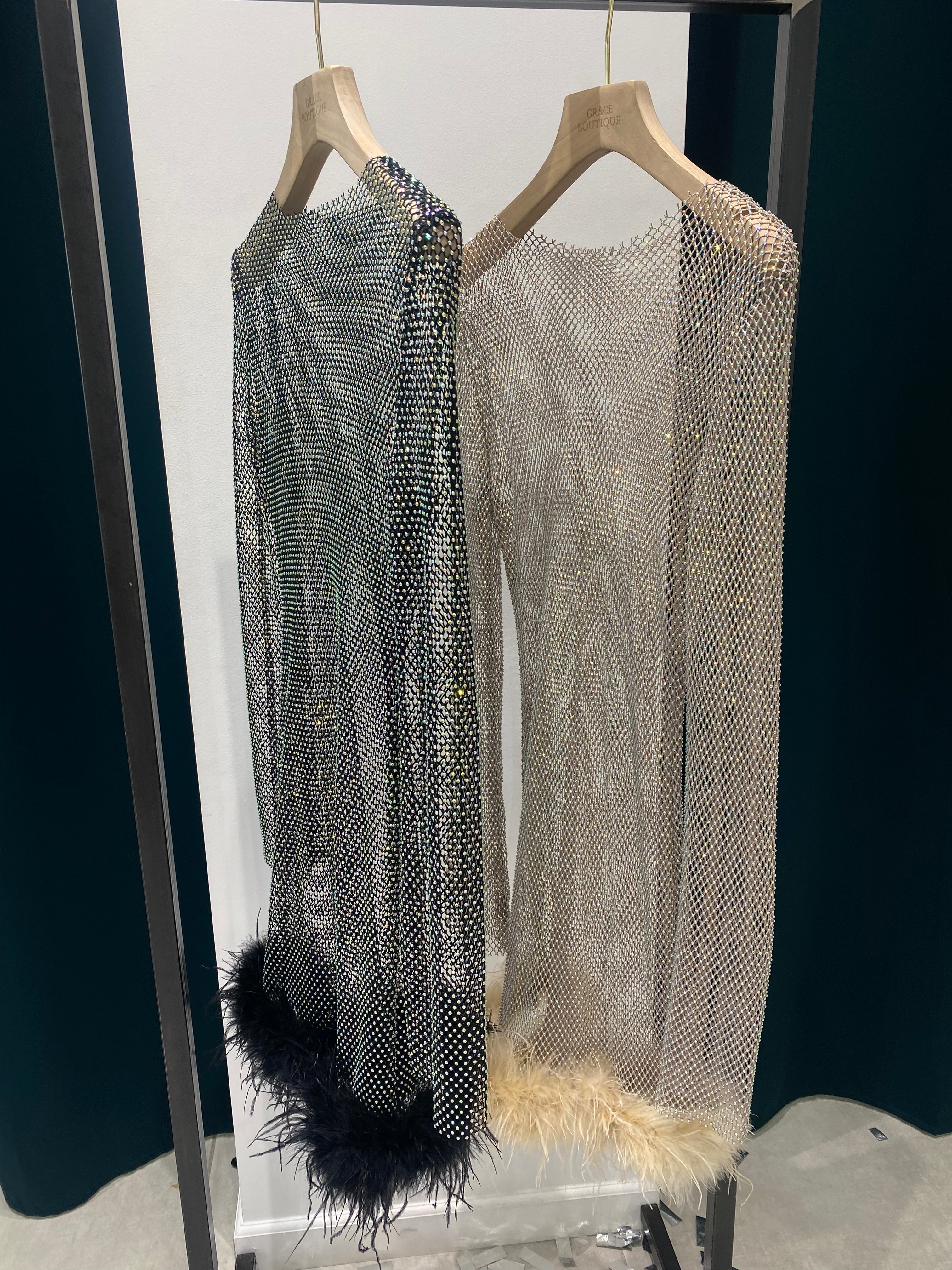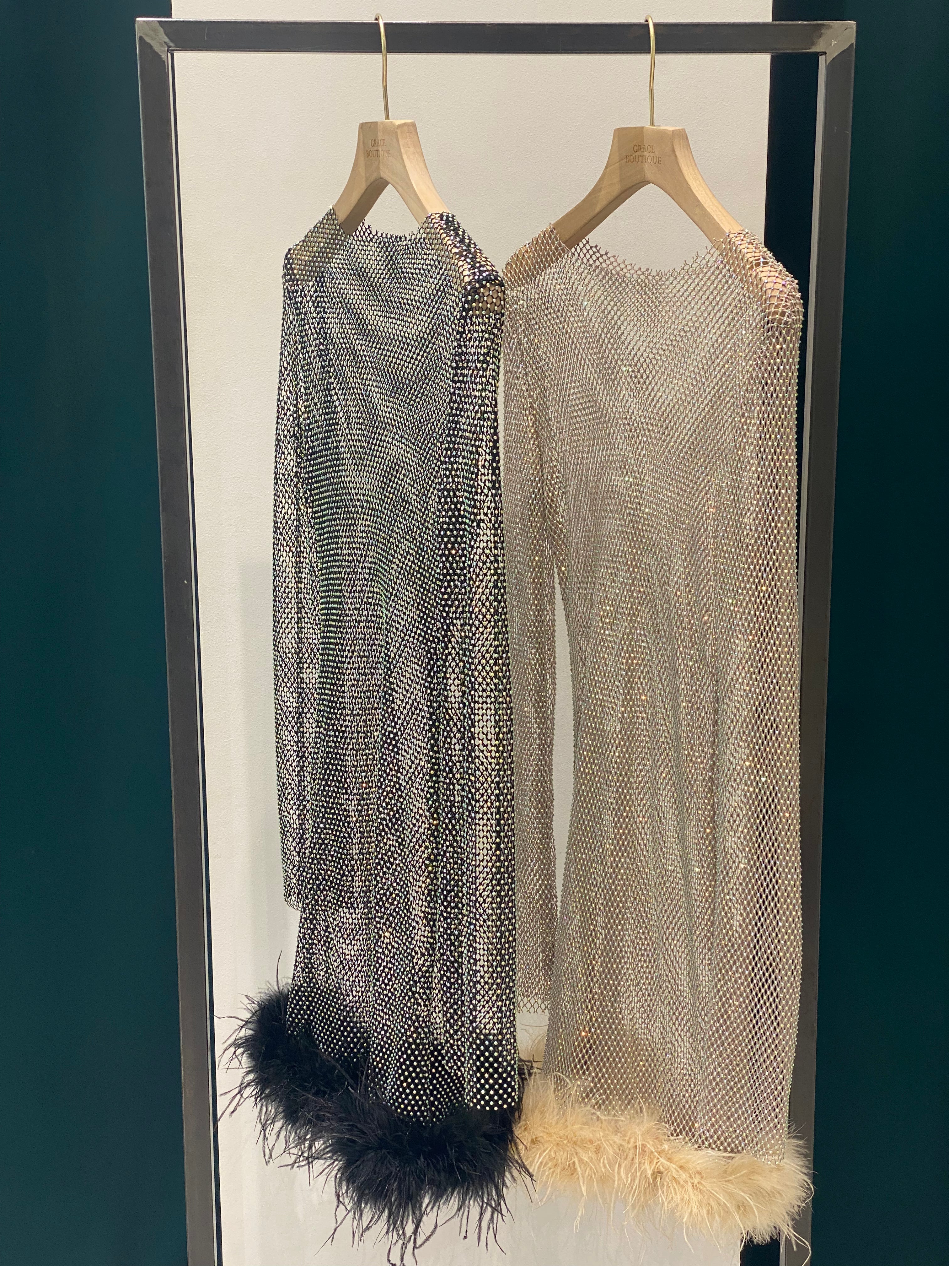 Shiny mini dresses with feathers