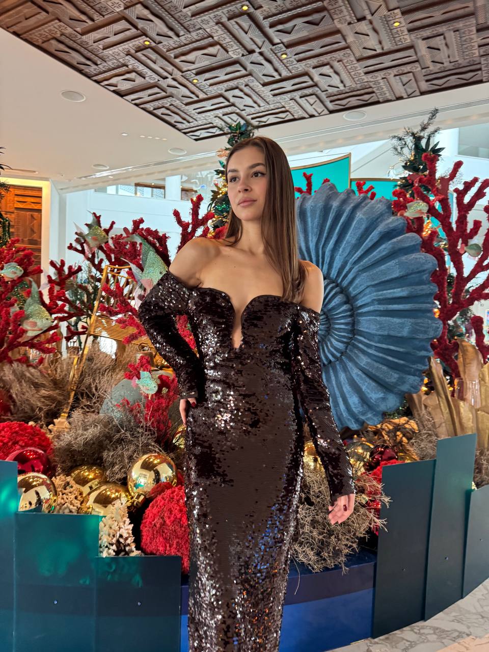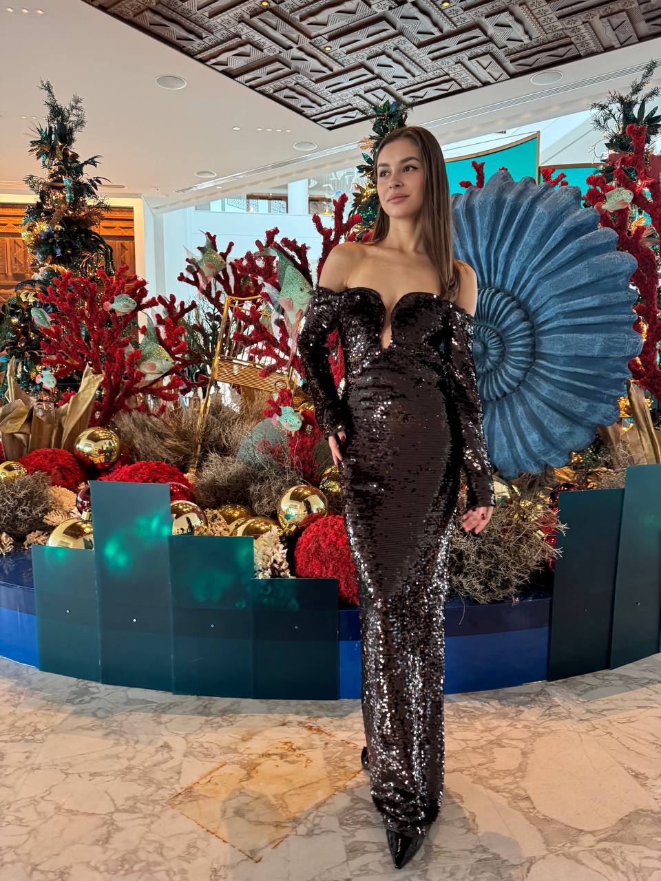 Crafted from intricate brown sequin, this dress features a stunning bardot neckline and is fitted at the waist for a flattering silhouette. The flared hem and front rouching add a touch of romanticism to this maxi length dress. Perfect for any special occasion, make a statement in style.