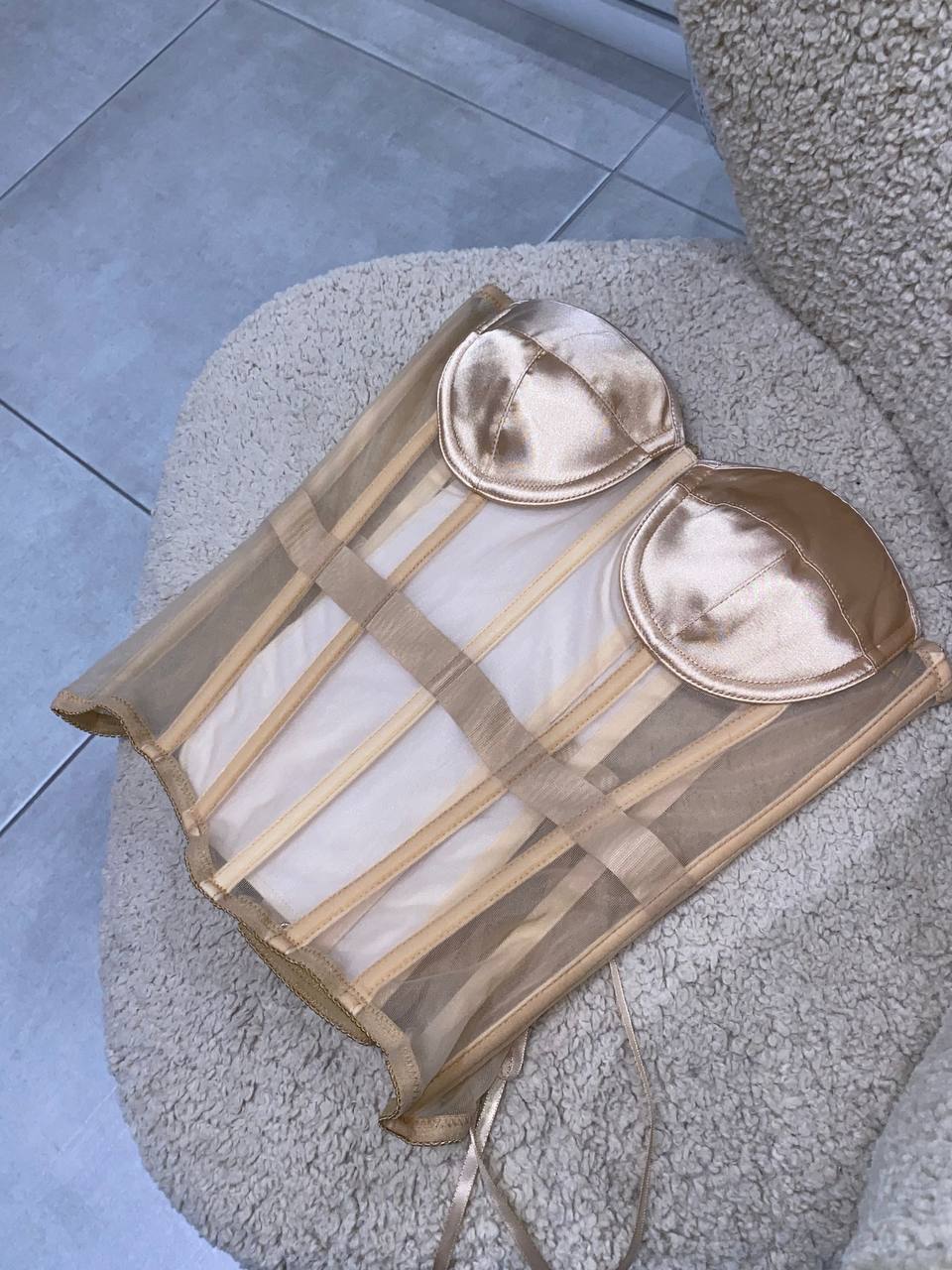 Champagne mesh ,sweetheart corset with padded bust.Lacing at the back