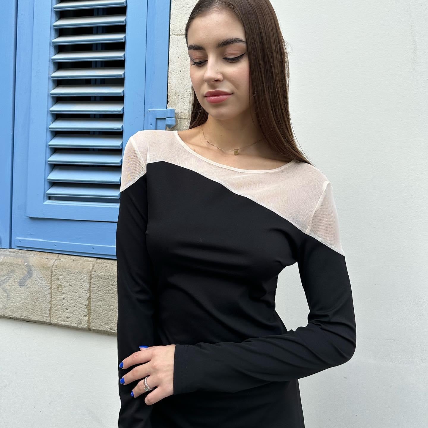 Perfect for getting that off-the-shoulder look, is a chic addition to any wardrobe. Features a mesh illusion neckline and flattering cut.