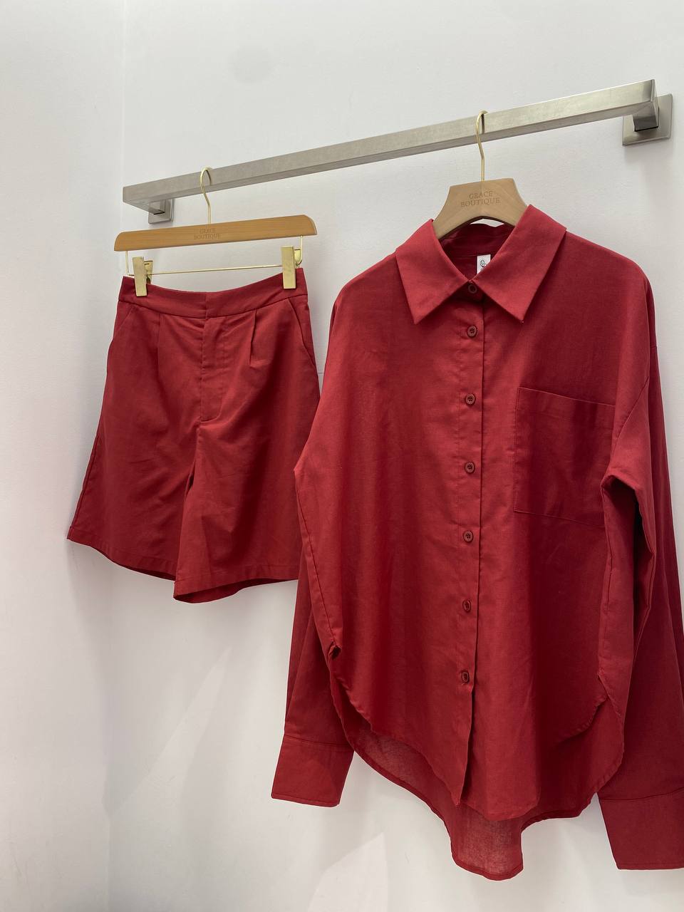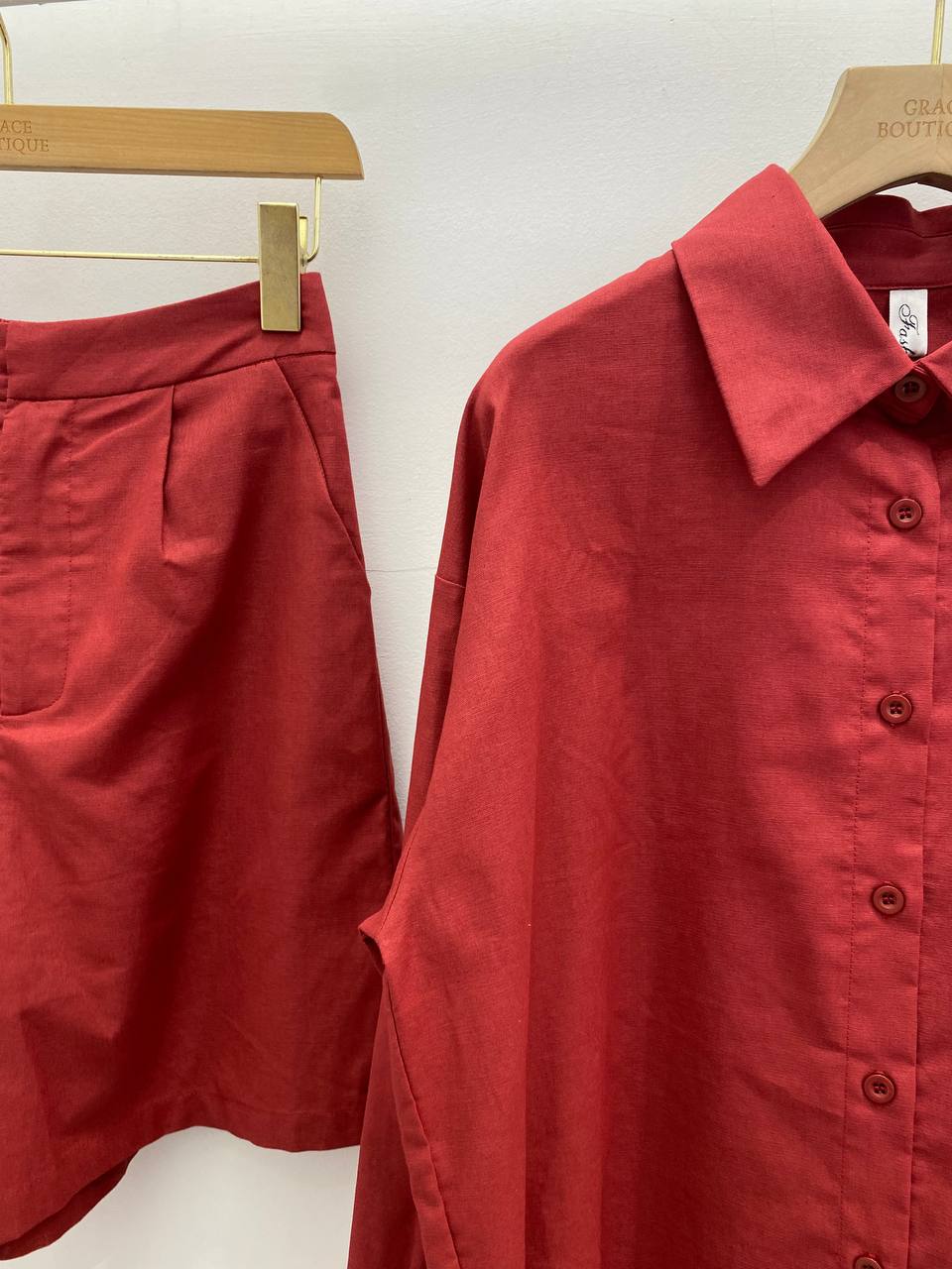 Ruby set of:loose fitting shirt with front pocket.High waisted shorts with side pockets.