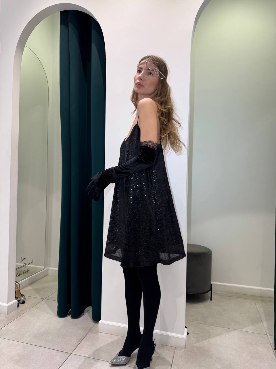 Black loose fitting dress,all-over sequin embellishment,round neck,sleeveless,adjustable spaghetti straps,full lining.