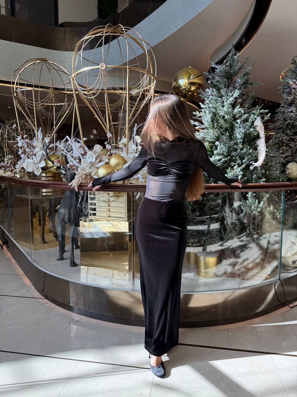 Elegant mesh dress with long sleeves,elastic material.Side zip closure.
