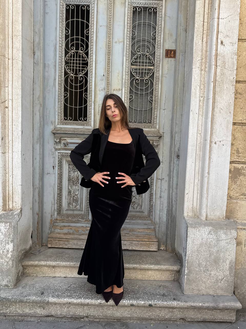 A velvet midi dress with a flared hem,delicate spaghetti straps,and fitted bodice.