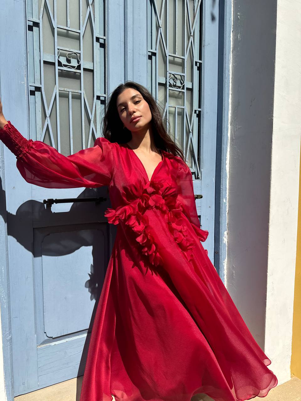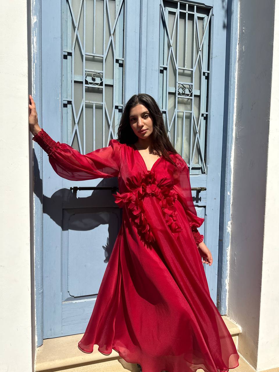 Puffy dress with long sleeves ,features v-neck cut,elastic waist,and open back with ties.Flowers details.