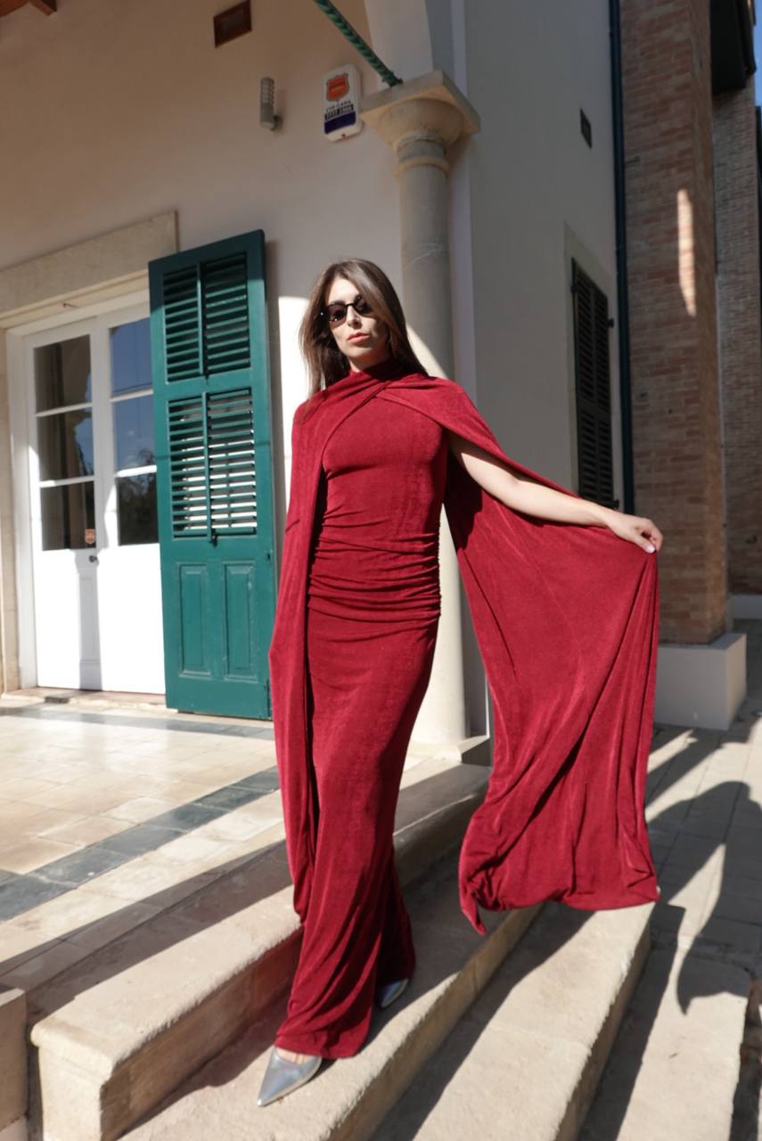 The defining feature is the dramatic, floor-length cape sleeves that flow from the shoulders and flare out behind the wearer, adding a touch of drama and Hollywood glamour.It has a long, body-hugging (bodycon or column) fit through the waist and hips that flares slightly into a mermaid shape at the hem, ensuring a graceful flow with movement.