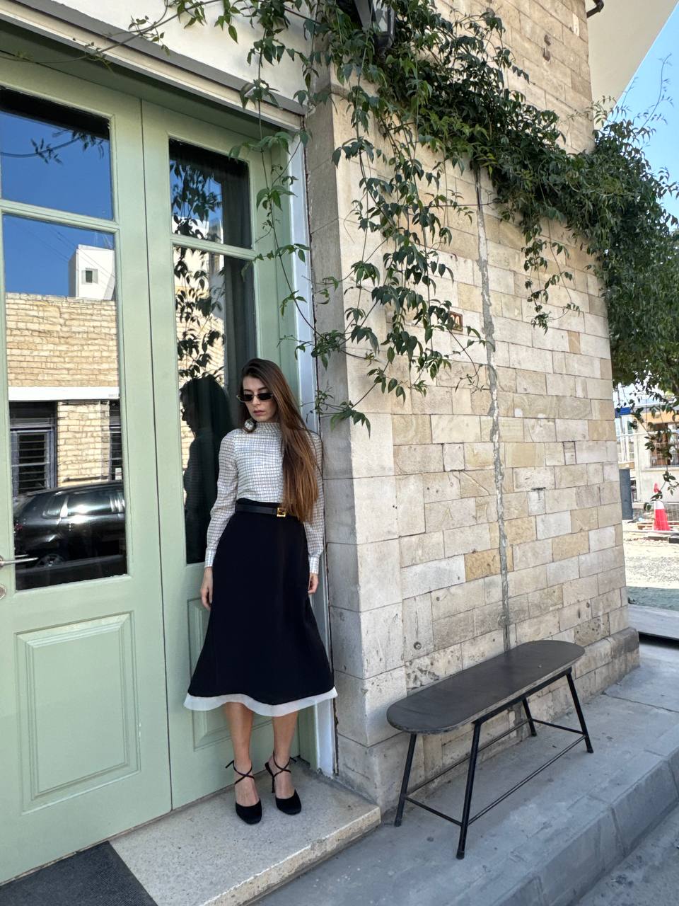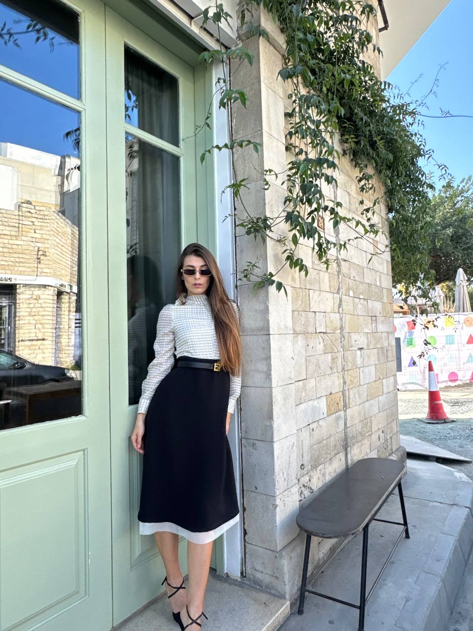 Classic dress consisting of a top with long sleeves,and ties on the neck.With black a-line skirt