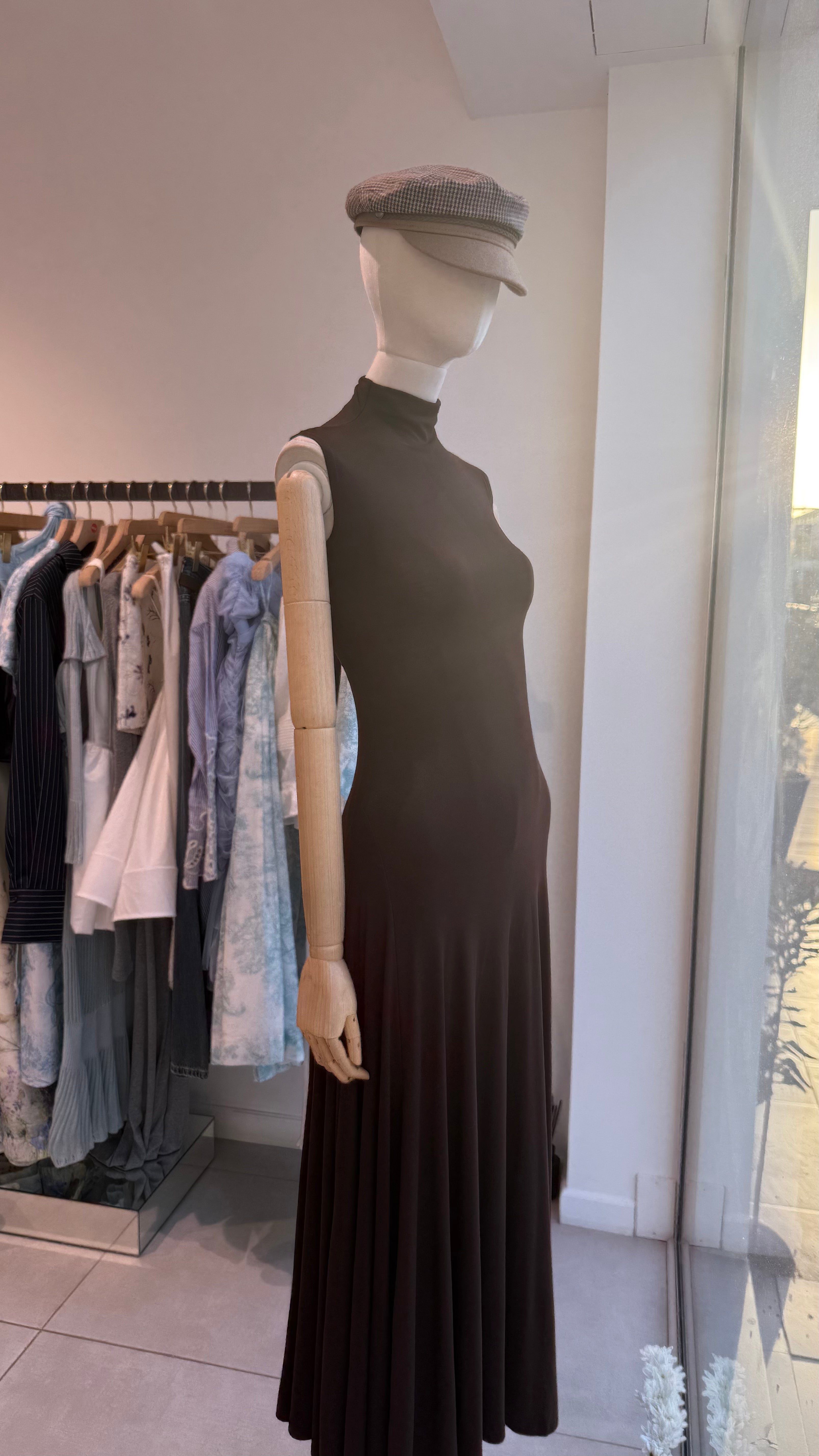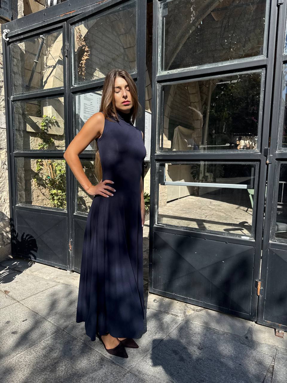 A dark blue knit maxi dress with a high neckline and sleeveless design.