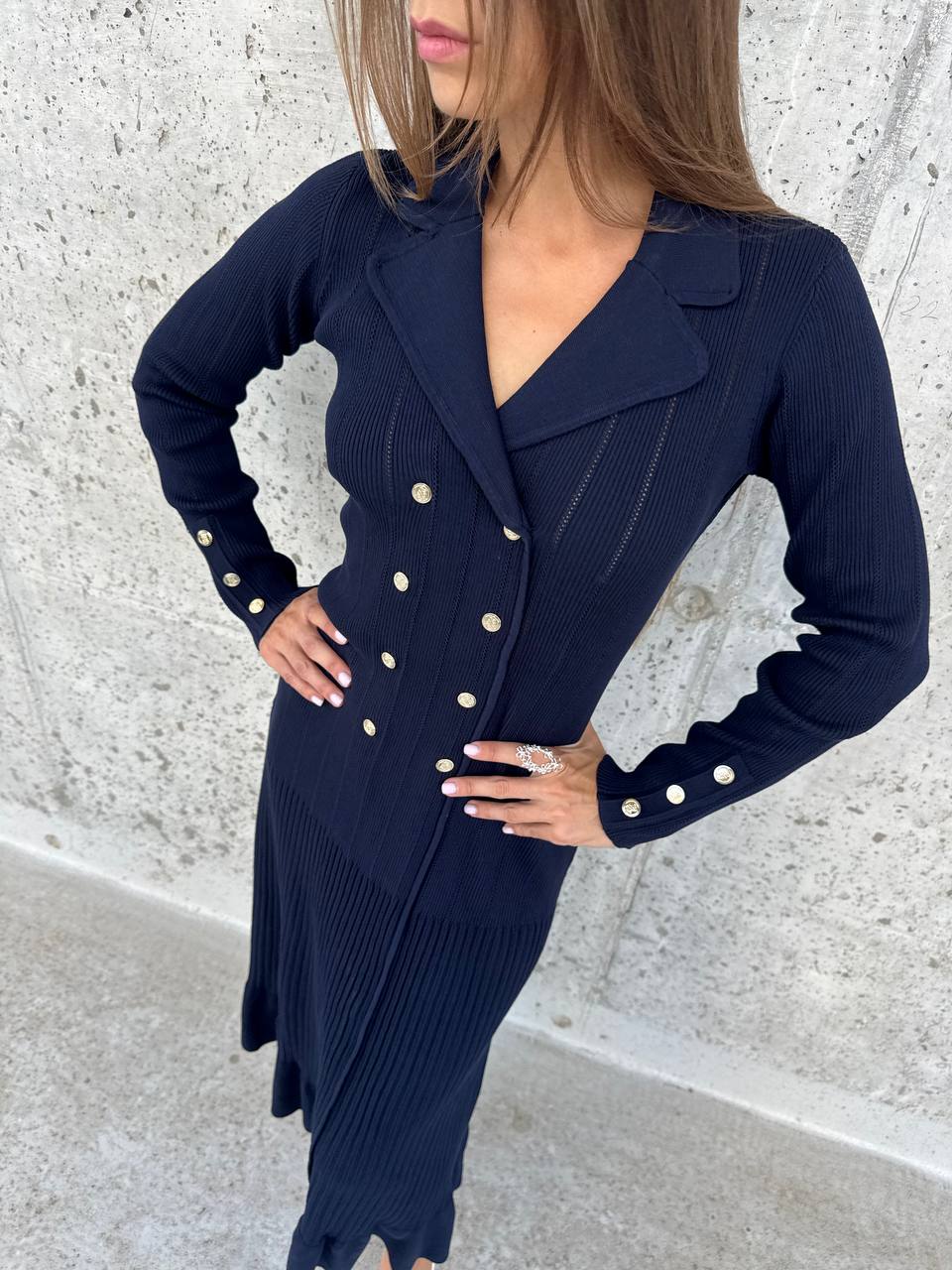 This long-sleeve style dress, knitted to a fit-and-flare silhouette, it’s topped with a smart collar and embellished with silver buttons for an extra touch of opulence.