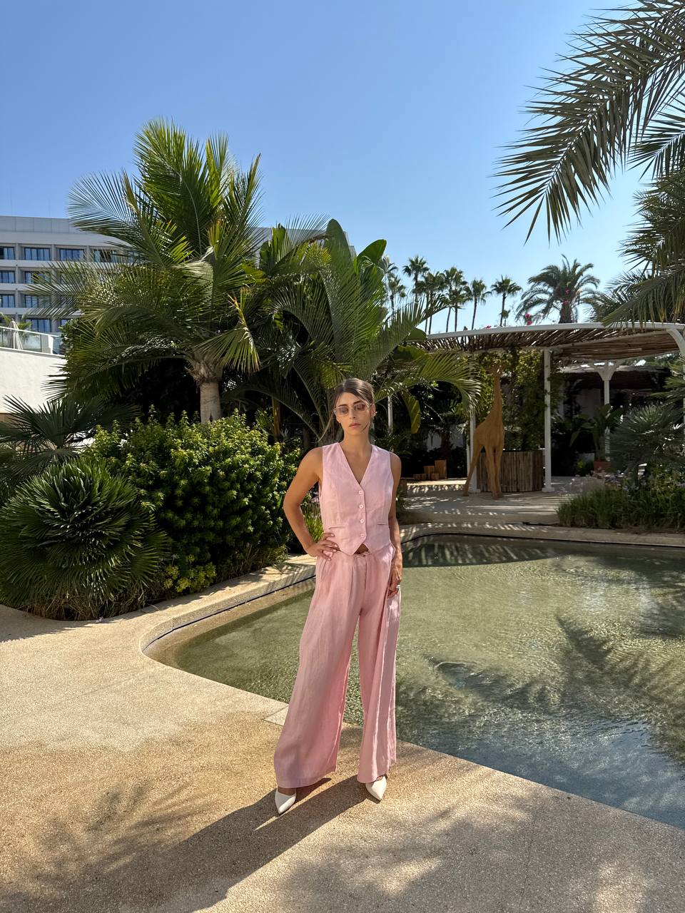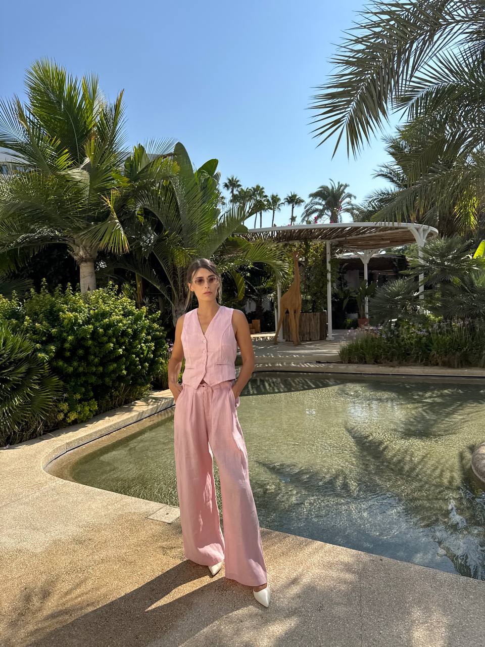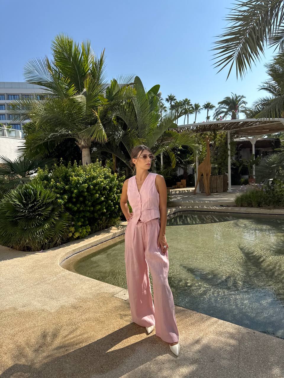 Linen pink fitted vest with flared style ,high waisted trousers.