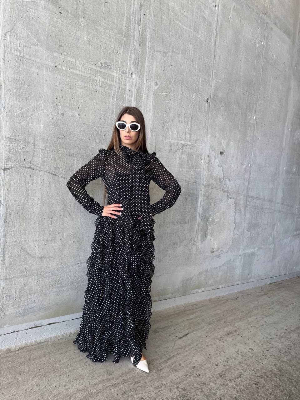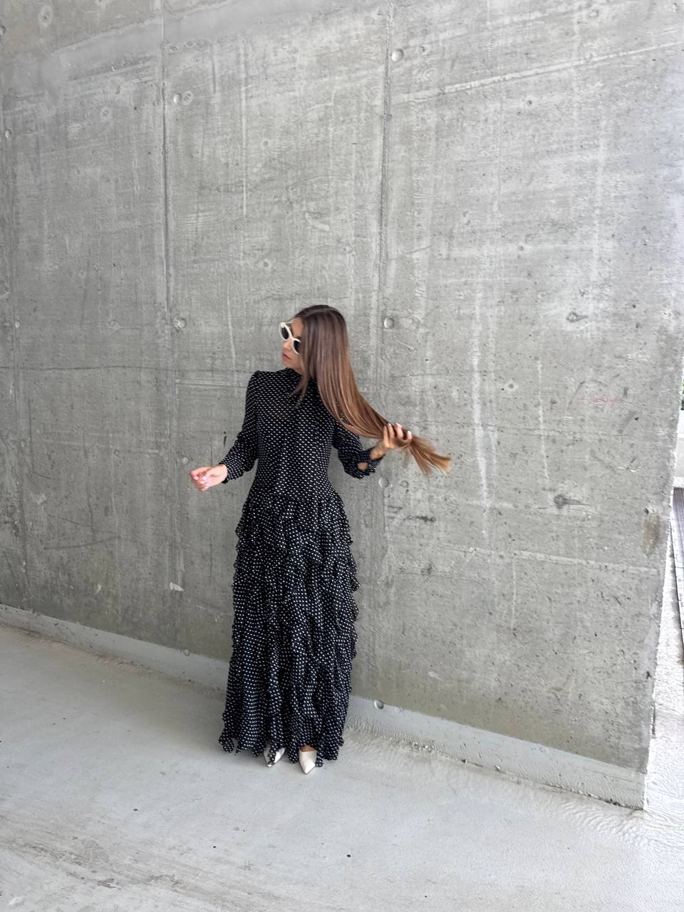 This elegant black dress features a polka dot pattern, a half high neck, fitted waist,and long sleeves, creating a sophisticated yet playful look.