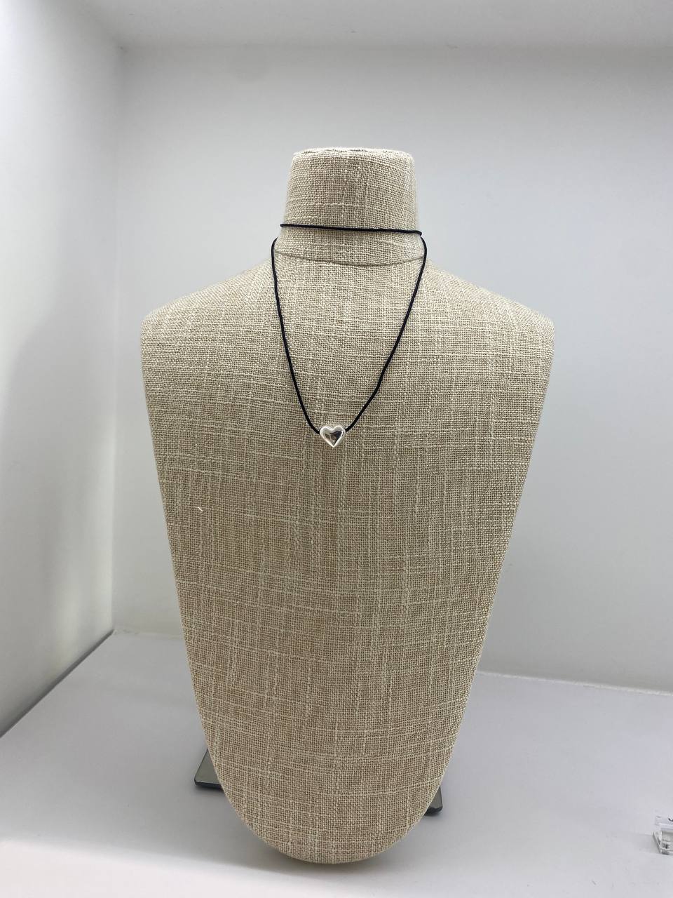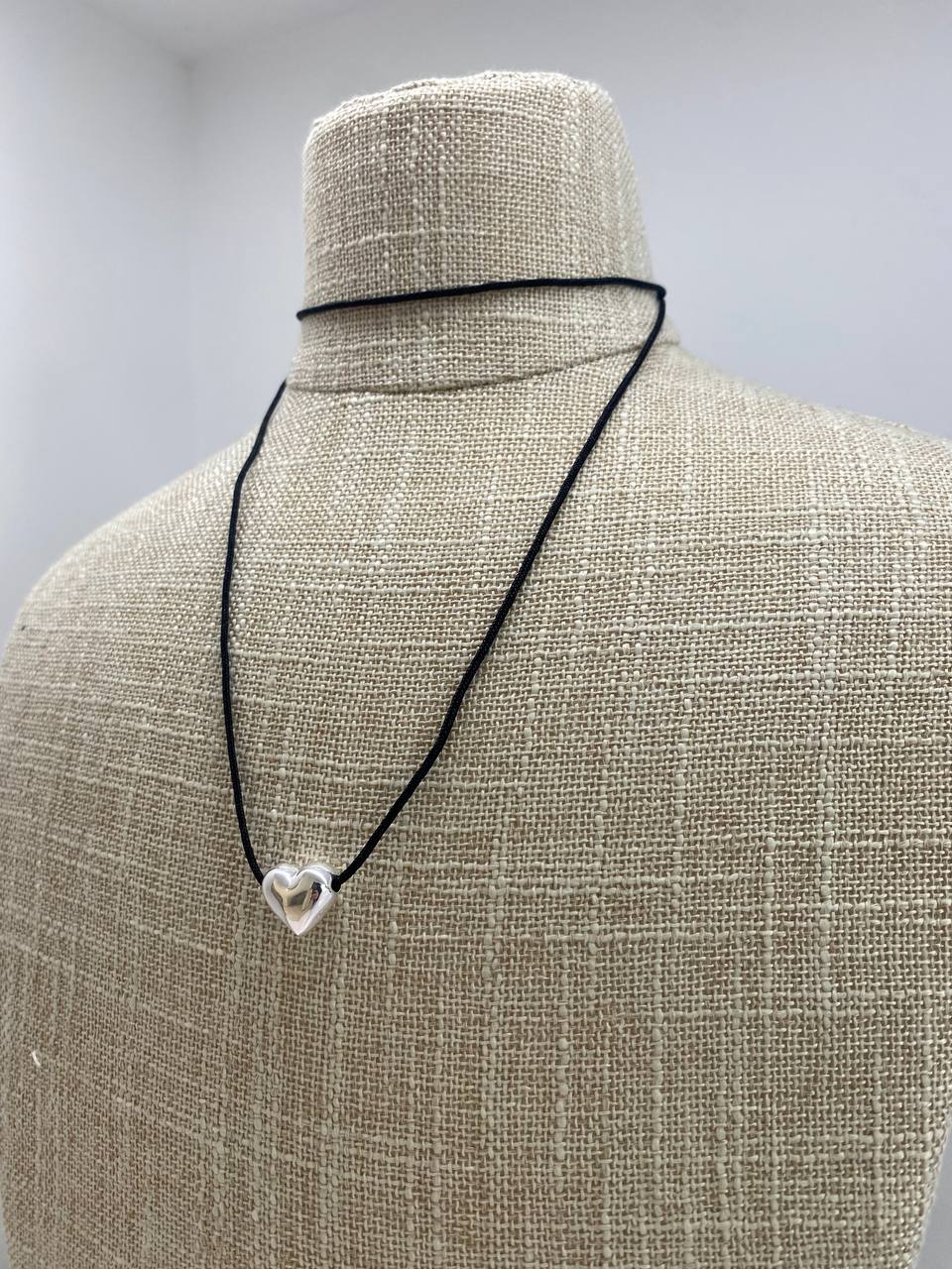 Necklace features 925 Sterling Silver ridged heart charm set on to a slim black cotton twisted cord.