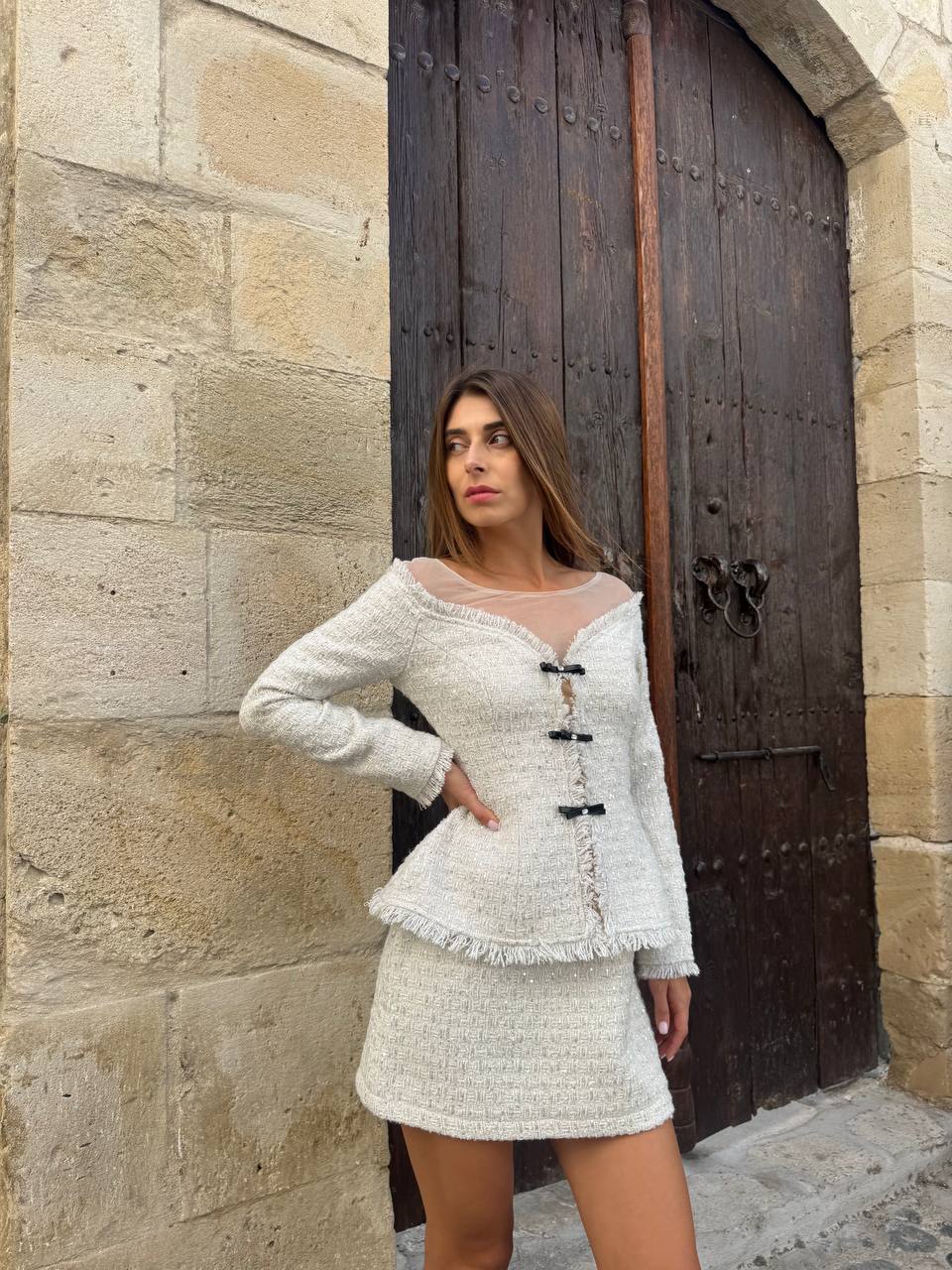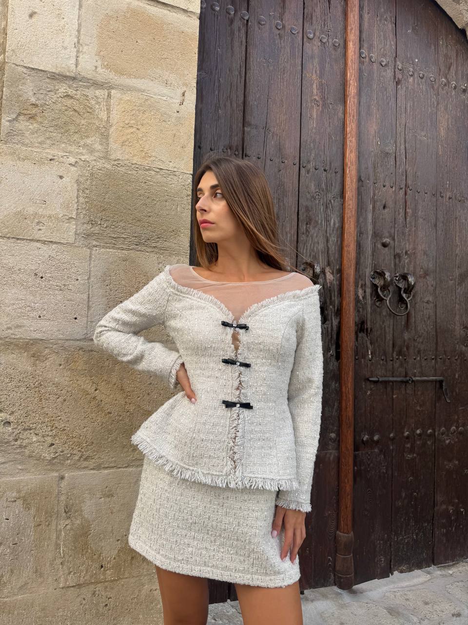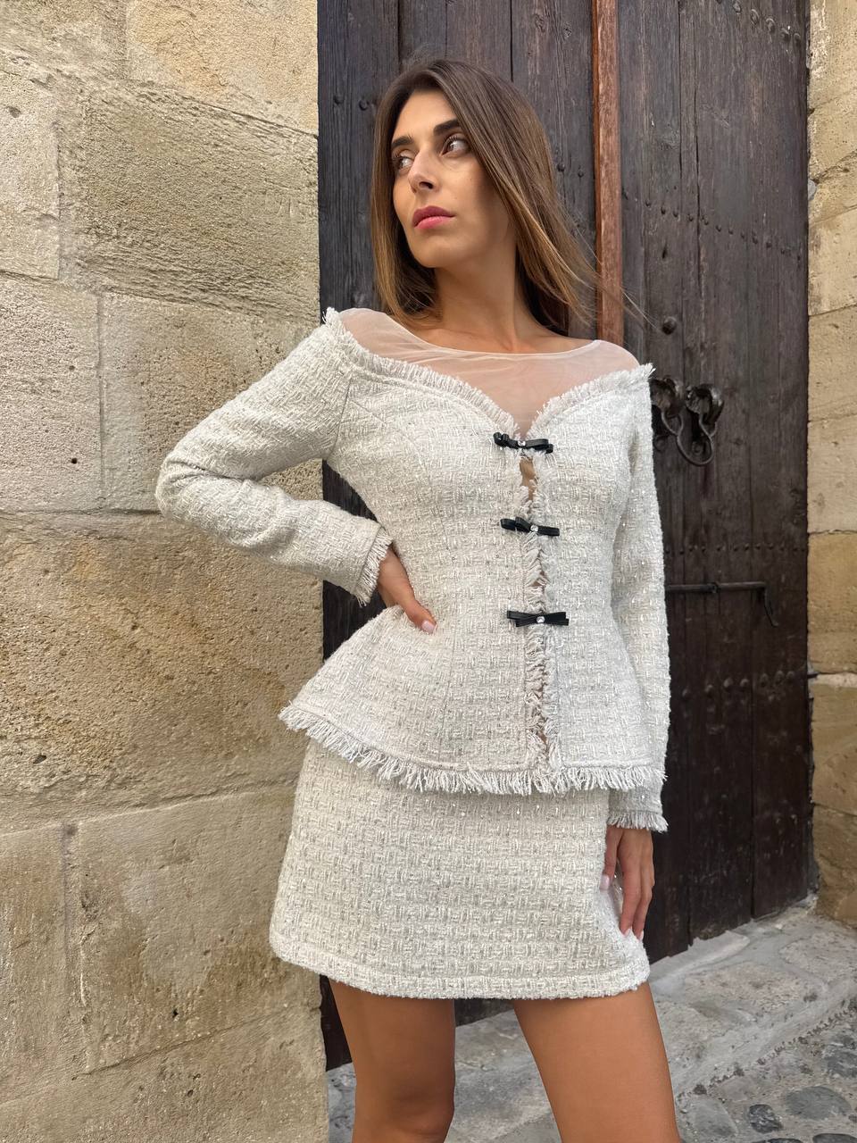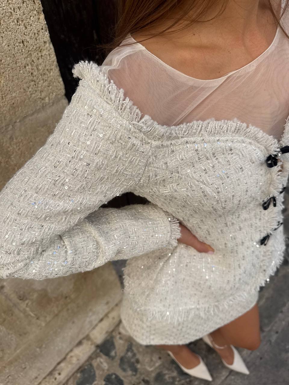 Beige double-layer ff shoulder dress with long sleeves ,a fitted waist, and front bows on the front.